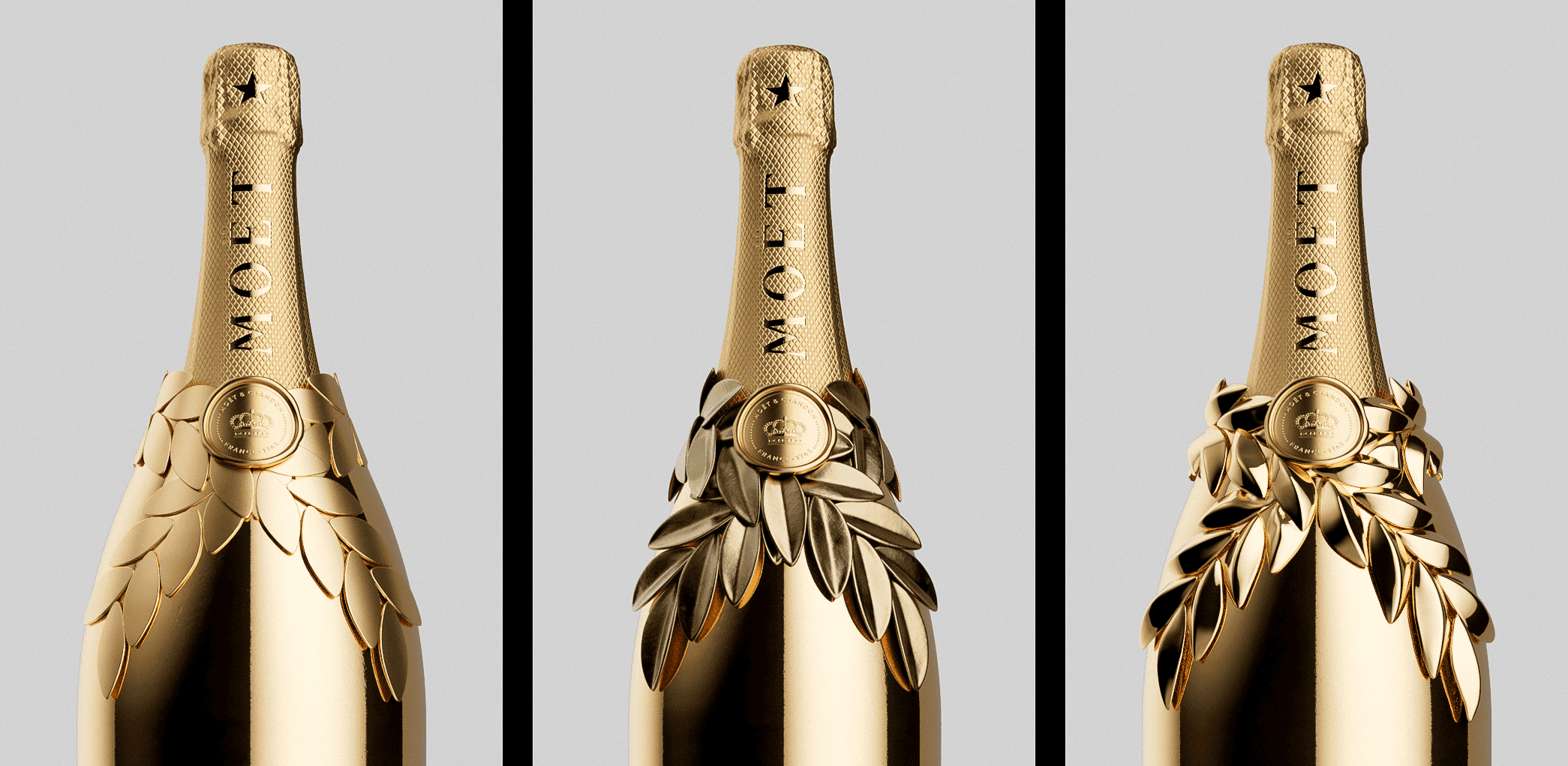 Working with NR2154, I supported the early product-design phase by developing a range of concept directions and building the 3D models for internal reviews. Among the explored routes was a laurel-inspired motif, a timeless symbol of triumph, that informed one of the design pathways presented to Moët & Chandon.